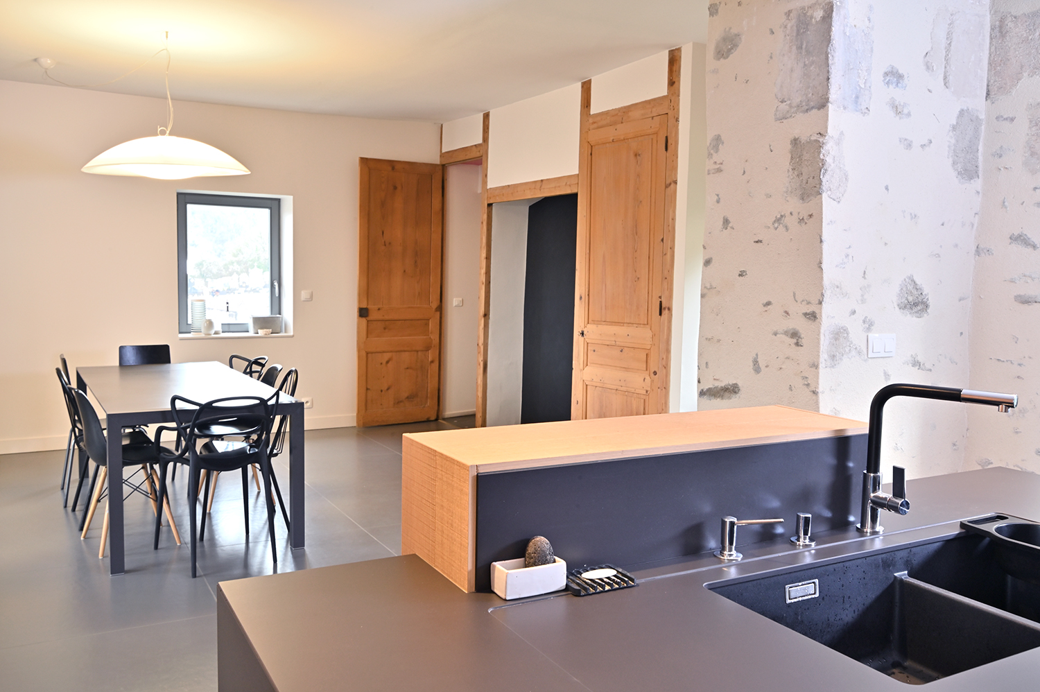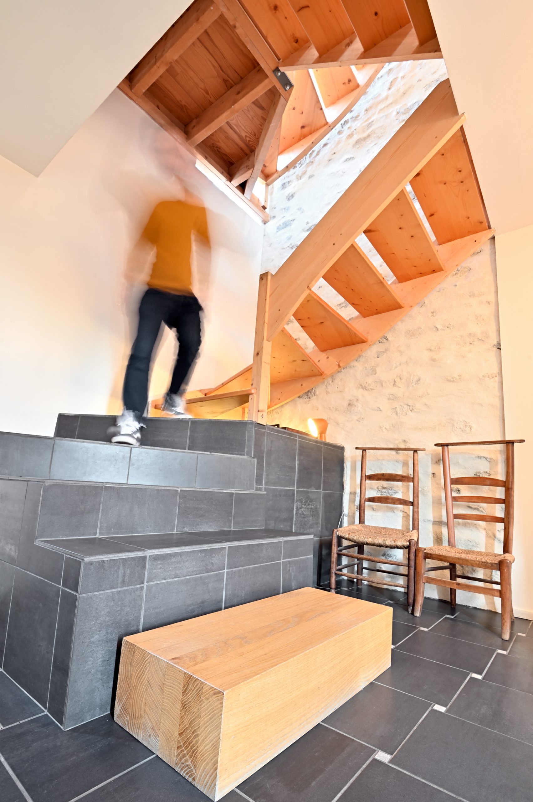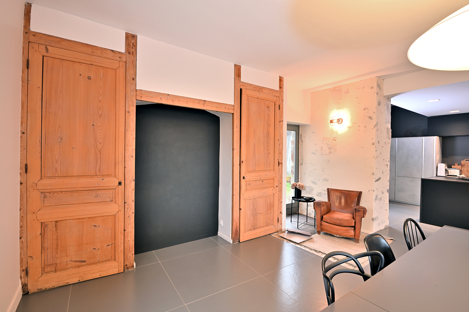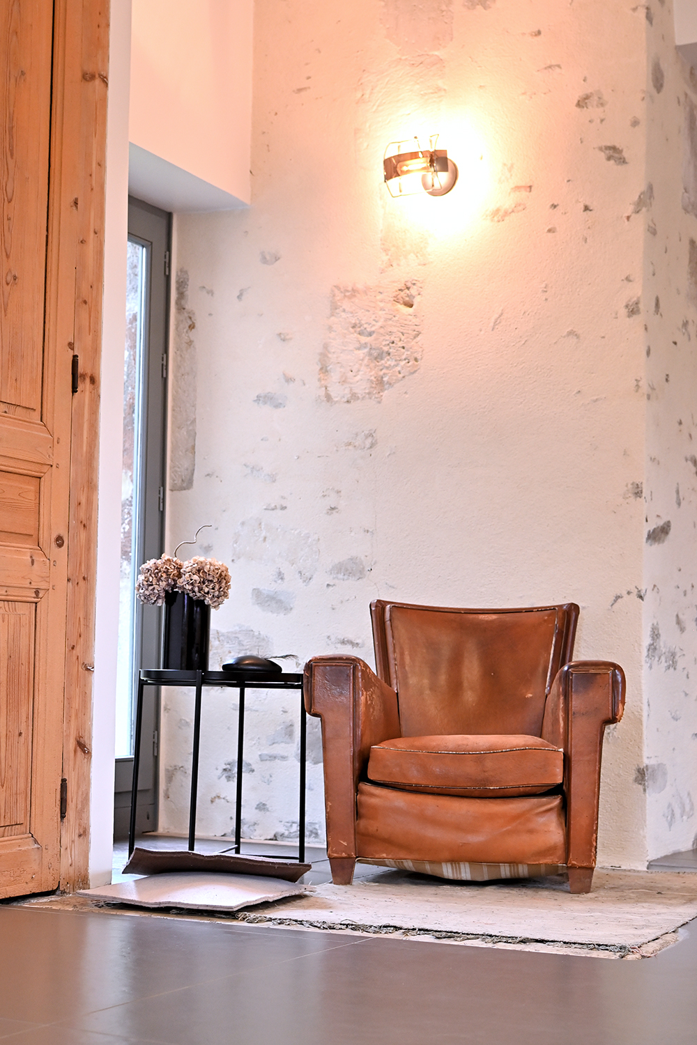Apporter une touche contemporaine et valoriser le patrimoine existant. Le parti pris a été de laisser passer le regard au travers des percements existants ou créés et de recycler les matériaux encore présents.